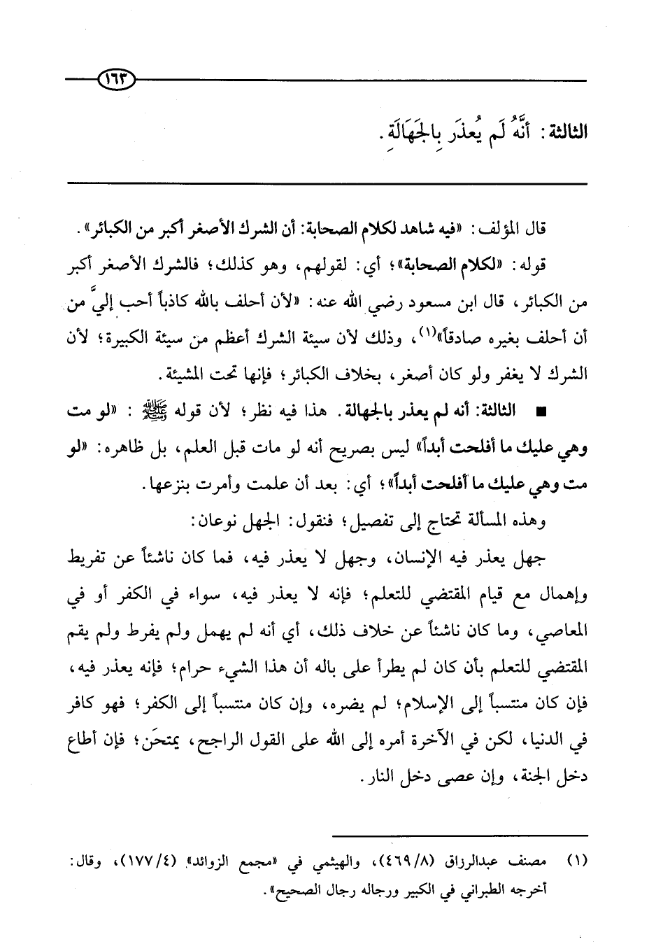 السادسة: التصريح بأن من تعلق شيئا؛ وكل إليه (¬1) . السابعة: التصريح بأن من تعلق تميمة؛ فقد أشرك. الثامنة: أن تعليق الخيط من الحمى من ذلك. التاسعة: تلاوة حذيفة الآية دليل على أن الصحابة يستدلون بالآيات التي في الشرك الأكبر على الأصغر؛ كما ذكر ابن عباس في آية البقرة.