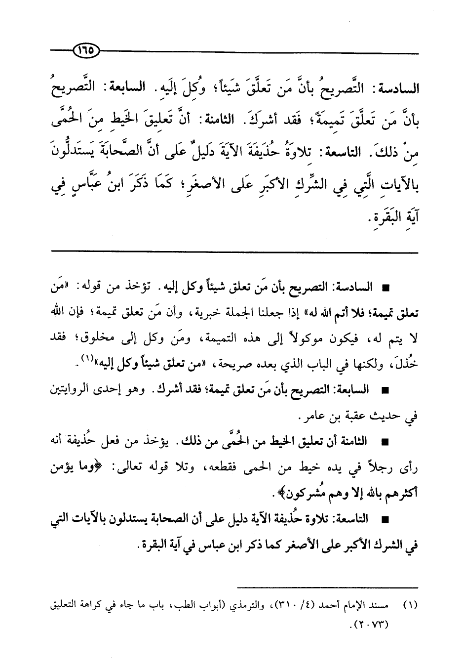 فهنا أيضا تقول له: لا أتم الله لك، ولكن الحديث إنما قاله الرسول صَلَّى اللَّهُ عَلَيْهِ وَسَلَّمَ على سبيل العموم؛ فلا نخاطب هذا بالتصريح ونقول لشخص رأينا عليه تميمة: لا أتم الله لك، وذلك لأن مخاطبتنا الفاعل بالتصريح والتعيين سوف يكون سببا لنفوره، ولكن نقول: دع التمائم أو الودع؛ فإن النبي صَلَّى اللَّهُ عَلَيْهِ وَسَلَّمَ يقول: «من تعلق تميمة؛ فلا أتم الله له، ومن تعلق ودعة؛ فلا ودع الله له» .