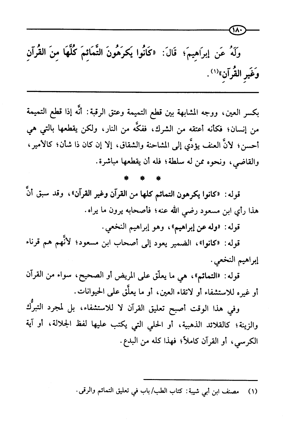الرابعة: أن الرقية بالكلام الحق من العين والحمة ليس من ذلك. الخامسة: أن التميمة إذا كانت من القرآن؛ فقد اختلف العلماء؛ هل هي من ذلك أم لا؟ السادسة: أن تعليق الأوتار على الدواب عن العين من ذلك.