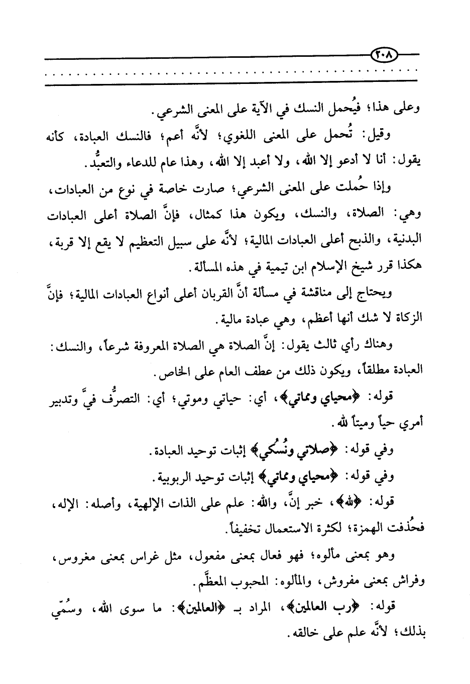 وإذا حملت على المعنى الشرعي؛ صارت خاصة في نوع من العبادات، وهي: الصلاة، والنسك، ويكون هذا كمثال، فإن الصلاة أعلى العبادات البدنية، والذبح أعلى العبادات المالية؛ لأنه على سبيل التعظيم لا يقع إلا قربة، هكذا قرر شيخ الإسلام ابن تيمية في هذه المسألة.