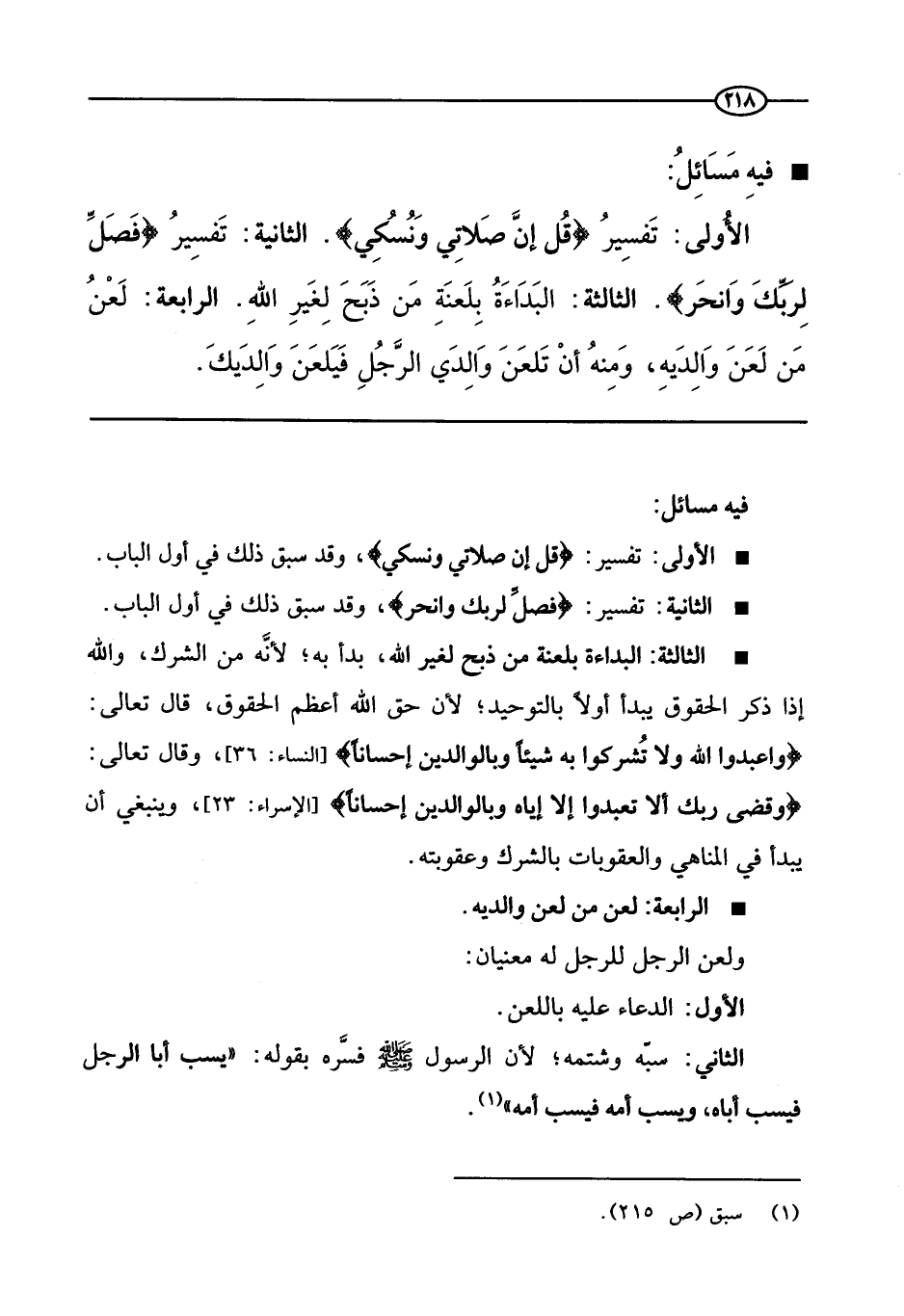 الأولى: تفسير {قُلْ إِنَّ صَلَاتِي وَنُسُكِي} . الثانية: تفسير {فَصَلِّ لِرَبِّكَ وَانْحَرْ} . الثالثة: البداءة بلعنة من ذبح لغير الله. الرابعة: لعن من لعن والديه، ومنه أن تلعن والدي الرجل فيلعن والديك.