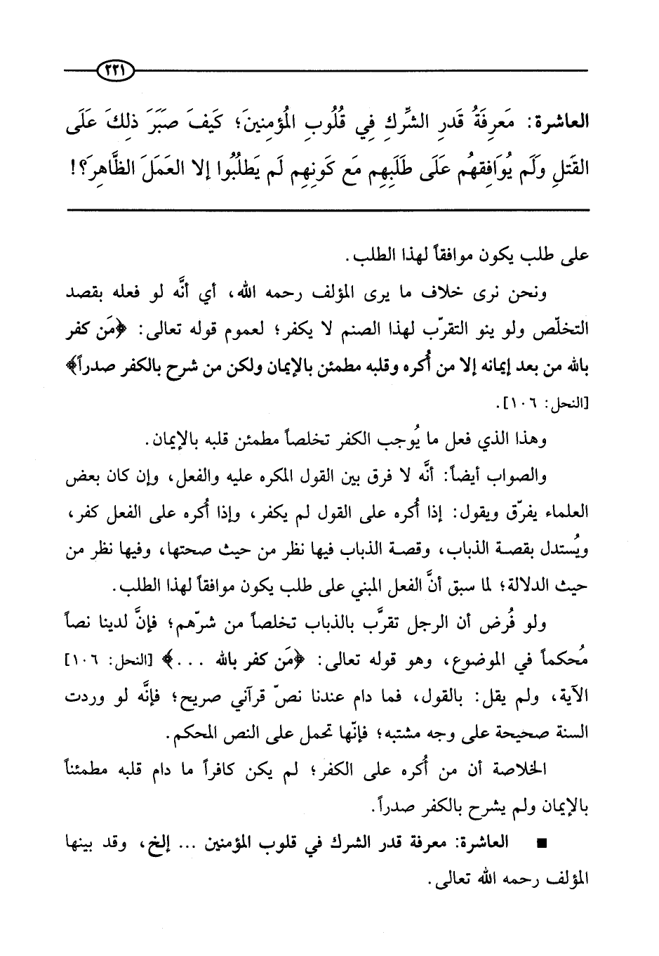 العاشرة: معرفة قدر الشرك في قلوب المؤمنين ... إلخ، وقد بينها المؤلف رحمه الله تعالى