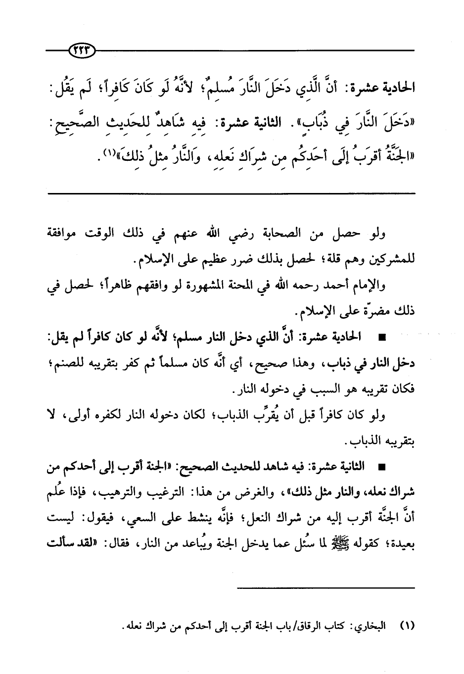 الحادية عشرة: أن الذي دخل النار مسلم؛ لأنه لو كان كافرا لم يقل: «دخل النار في ذباب» . الثانية عشرة: فيه شاهد للحديث الصحيح: «الجنة أقرب إلى أحدكم من شراك نعله، والنار مثل ذلك» .