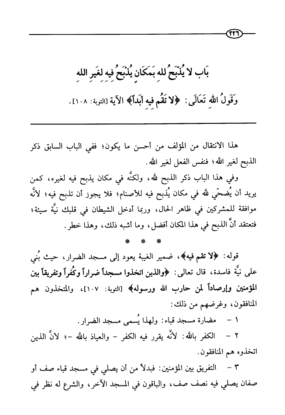 وفي هذا الباب ذكر الذبح لله، ولكنه في مكان يذبح فيه لغيره، كمن يريد أن يضحي لله في مكان يذبح فيه للأصنام؛ فلا يجوز أن تذبح فيه؛ لأنه موافقة للمشركين في ظاهر الحال، وربما أدخل الشيطان في قلبك نية سيئة؛ فتعتقد أن الذبح في هذا المكان أفضل، وما أشبه ذلك، وهذا خطر.