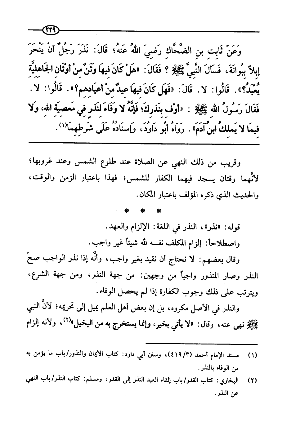 وعن ثابت بن الضحاك رضي الله عنه؛ قال: «نذر رجل أن ينحر إبلا ببوانة، فسأل النبي صَلَّى اللَّهُ عَلَيْهِ وَسَلَّمَ؟ فقال: (هل كان فيها وثن من أوثان الجاهلية يعبد؟ . قالوا: لا. قال: (فهل كان فيها عيد من أعيادهم؟) . قالوا: لا. فقال رسول الله صَلَّى اللَّهُ عَلَيْهِ وَسَلَّمَ: (أوف بنذرك؛ فإنه لا وفاء لنذر في معصية الله، ولا فيما لا يملك ابن آدم» . رواه أبو داود، وإسناده على شرطهما (¬1)