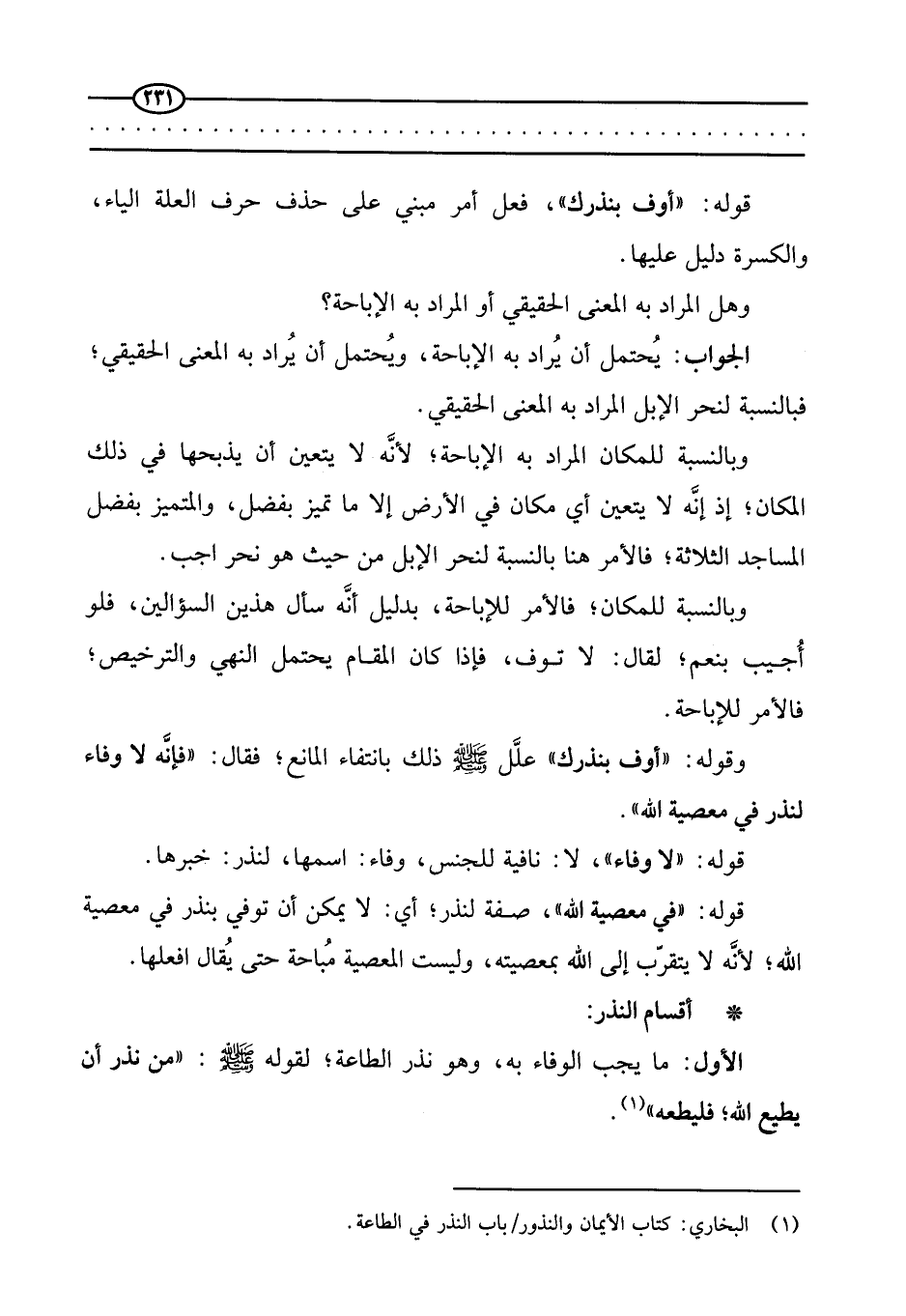 وقوله: (أوف بنذرك) علل صَلَّى اللَّهُ عَلَيْهِ وَسَلَّمَ ذلك بانتفاء المانع؛ فقال: «فإنه لا وفاء لنذر في معصية الله» .