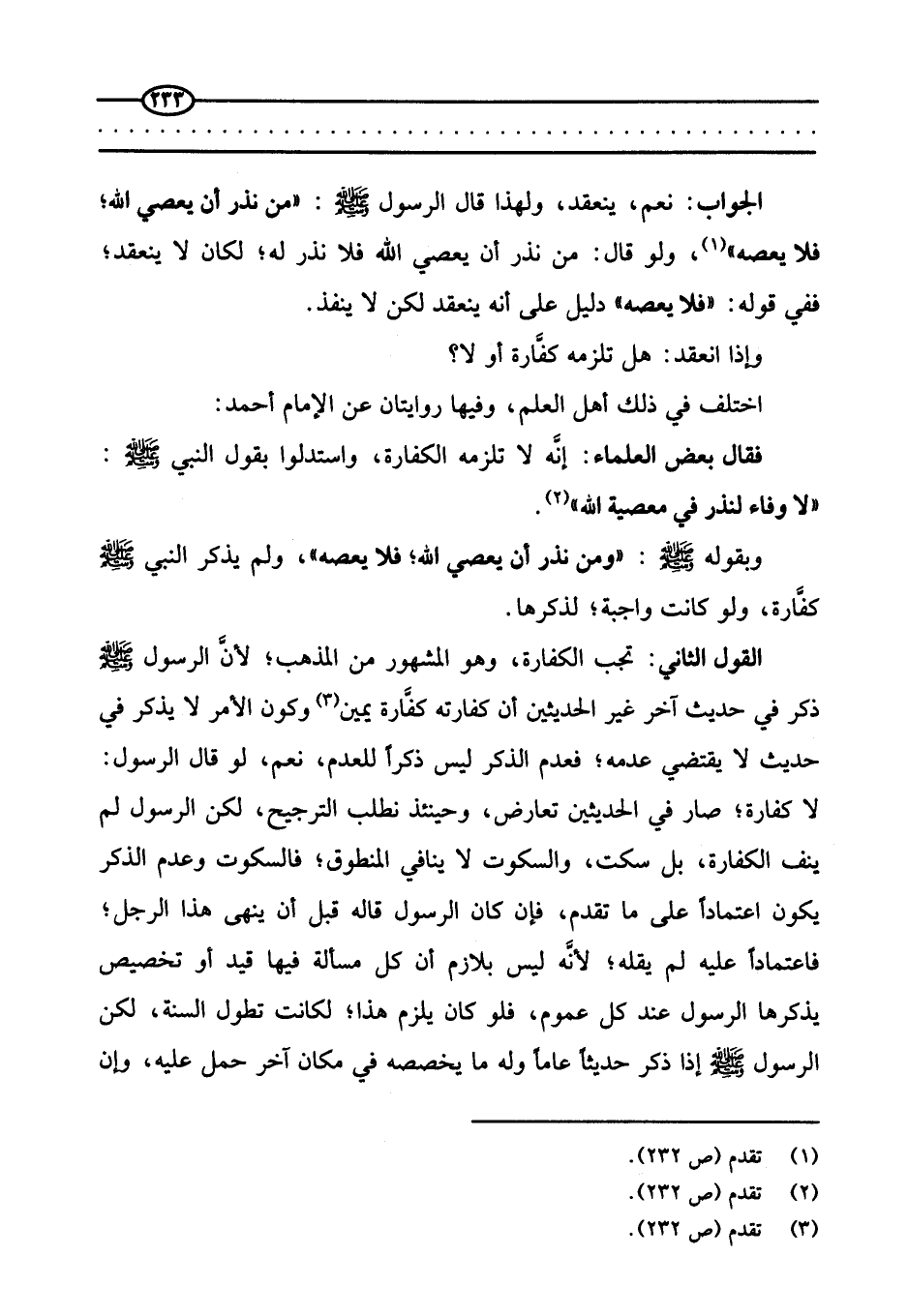 وبقوله صَلَّى اللَّهُ عَلَيْهِ وَسَلَّمَ: «ومن نذر أن يعصي الله؛ فلا يعصه» ، ولم يذكر النبي صَلَّى اللَّهُ عَلَيْهِ وَسَلَّمَ كفارة، ولو كانت واجبة؛ لذكرها.
