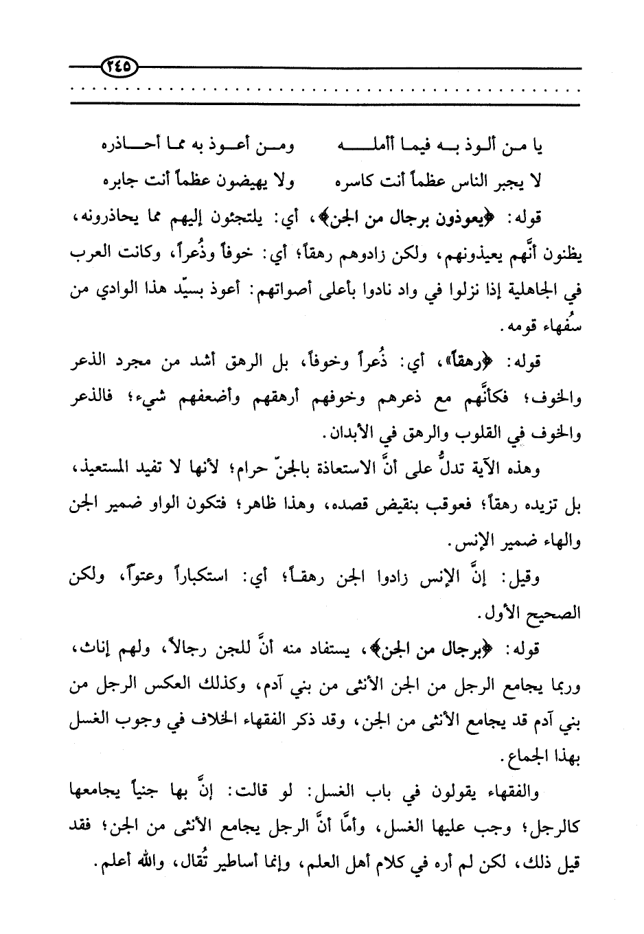 وهذه الآية تدل على أن الاستعاذة بالجن حرام؛ لأنها لا تفيد المستعيذ، بل تزيده رهقا؛ فعوقب بنقيض قصده، وهذا ظاهر؛ فتكون الواو ضمير الجن والهاء ضمير الإنس.