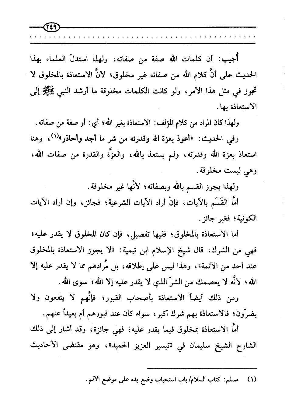 أجيب: أن كلمات الله صفة من صفاته، ولهذا استدل العلماء بهذا الحديث على أن كلام الله من صفاته غير مخلوق؛ لأن الاستعاذة بالمخلوق لا تجوز في مثل هذا الأمر، ولو كانت الكلمات مخلوقة ما أرشد النبي صَلَّى اللَّهُ عَلَيْهِ وَسَلَّمَ إلى الاستعاذة بها.