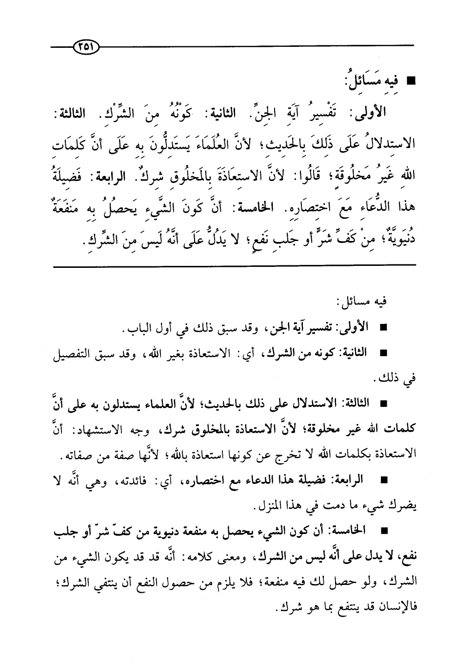 الأولى: تفسير آية الجن. الثانية: كونه من الشرك. الثالثة: الاستدلال على ذلك بالحديث؛ لأن العلماء يستدلون به على أن كلمات الله غير مخلوقة؛ قالوا: لأن الاستعاذة بالمخلوق شرك. الرابعة: فضيلة هذا الدعاء مع اختصاره. الخامسة: أن كون الشيء يحصل به منفعة دنيوية؛ من كف شر أو جلب نفع؛ لا يدل على أنه ليس من الشرك.