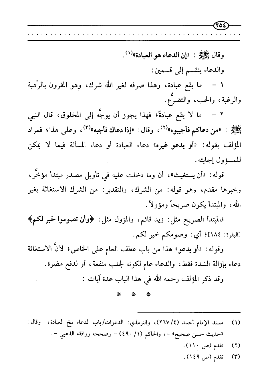 2 - ما لا يقع عبادة؛ فهذا يجوز أن يوجه إلى المخلوق، قال النبي صَلَّى اللَّهُ عَلَيْهِ وَسَلَّمَ: «من دعاكم فأجبيوه» ، وقال: «إذا دعاك فأجبه» ، وعلى هذا؛ فمراد المؤلف بقوله: (أو يدعو غيره) دعاء العبادة أو دعاء المسألة فيما لا يمكن للمسؤول إجابته.