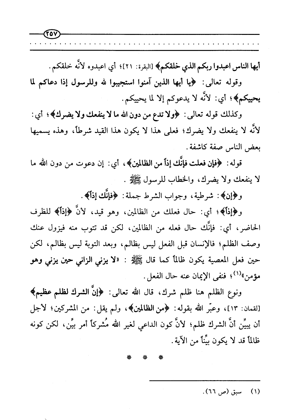 وكذلك قوله تعالى: {وَلَا تَدْعُ مِنْ دُونِ اللَّهِ مَا لَا يَنْفَعُكَ وَلَا يَضُرُّكَ} ؛ أي: لأنه لا ينفعك ولا يضرك؛ فعلى هذا لا يكون هذا القيد شرطا، وهذه يسميها بعض الناس صفة كاشفة.