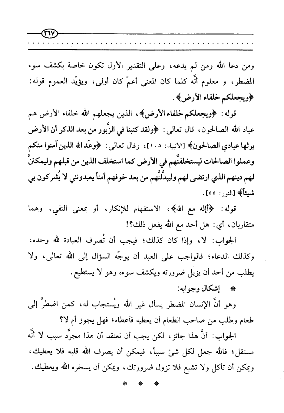 قوله: {وَيَجْعَلُكُمْ خُلَفَاءَ الْأَرْضِ} ، الذين يجعلهم الله خلفاء الأرض هم عباد الله الصالحون، قال تعالى: {وَلَقَدْ كَتَبْنَا فِي الزَّبُورِ مِنْ بَعْدِ الذِّكْرِ أَنَّ الْأَرْضَ يَرِثُهَا عِبَادِيَ الصَّالِحُونَ} [الأنبياء: 105] ، وقال تعالى: {وَعَدَ اللَّهُ الَّذِينَ آمَنُوا مِنْكُمْ وَعَمِلُوا الصَّالِحَاتِ لَيَسْتَخْلِفَنَّهُمْ فِي الْأَرْضِ كَمَا اسْتَخْلَفَ الَّذِينَ مِنْ قَبْلِهِمْ وَلَيُمَكِّنَنَّ لَهُمْ دِينَهُمُ الَّذِي ارْتَضَى لَهُمْ وَلَيُبَدِّلَنَّهُمْ مِنْ بَعْدِ خَوْفِهِمْ أَمْنًا يَعْبُدُونَنِي لَا يُشْرِكُونَ بِي شَيْئًا} [النور: 55] .