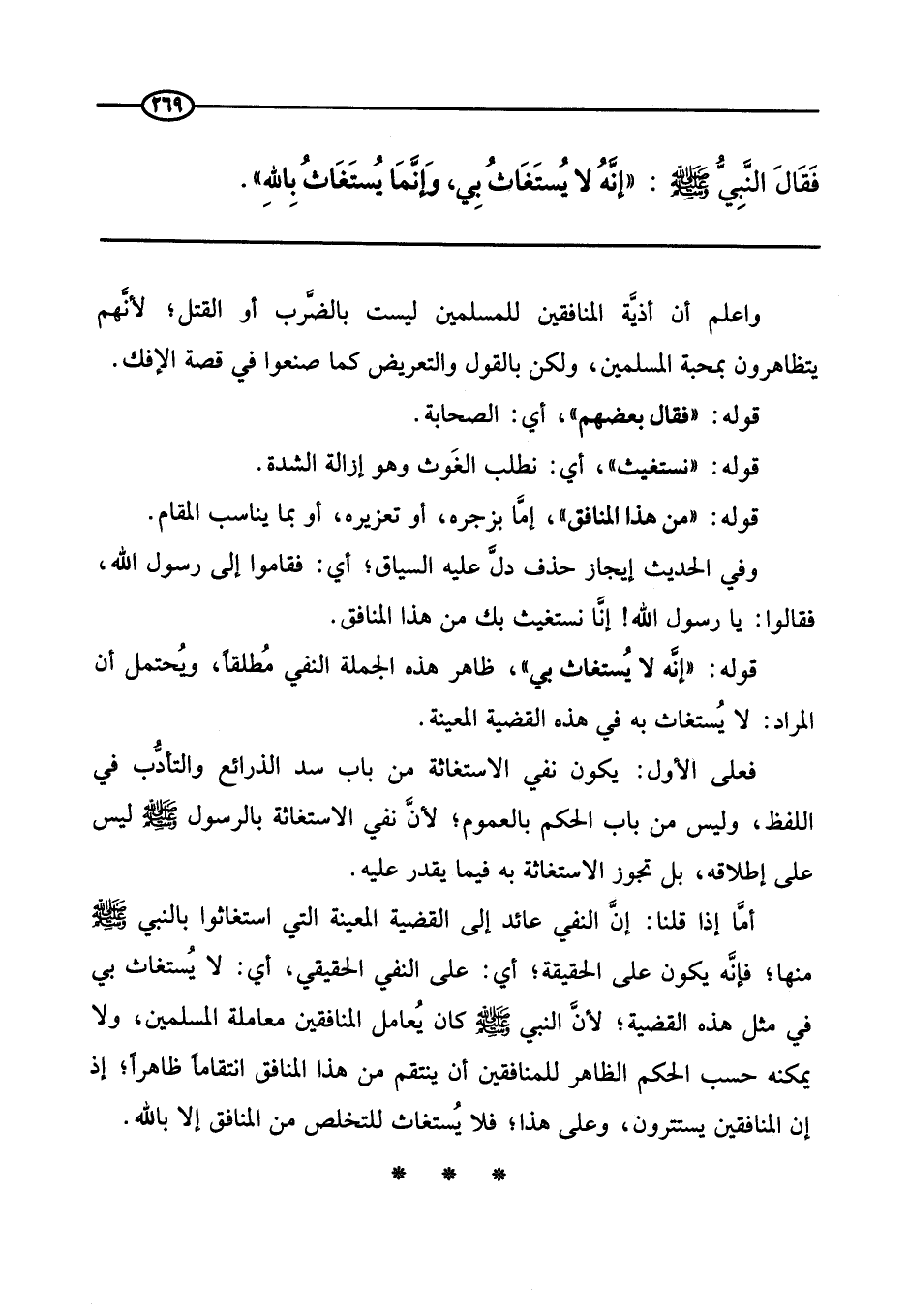 أما إذا قلنا: إن النفي عائد إلى القضية المعنية التي استغاثوا بالنبي صَلَّى اللَّهُ عَلَيْهِ وَسَلَّمَ منها؛ فإنه يكون على الحقيقة، أي: على النفي الحقيقي، أي: لا يستغاث بي في مثل هذه القضية؛ لأن النبي صَلَّى اللَّهُ عَلَيْهِ وَسَلَّمَ كان يعامل المنافقين معاملة المسلمين، ولا يمكنه حسب الحكم الظاهر للمنافقين أن ينتقم من هذا المنافق انتقاما ظاهرا؛ إذ إن المنافقين يستترون، وعلى هذا؛ فلا يستغاث للتخلص من المنافق إلا بالله.