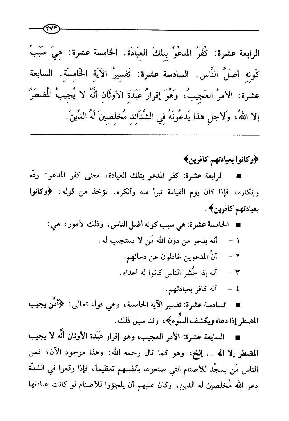 الرابعة عشرة: كفر المدعو بتلك العبادة. الخامسة عشرة: هي سبب كونه أضل الناس. السادسة عشرة: تفسير الآية الخامسة. السابعة عشرة: الأمر العجيب، وهو إقرار عبدة الأوثان أنه لا يجيب المضطر إلا الله، ولأجل هذا يدعونه في الشدائد مخلصين له الدين.