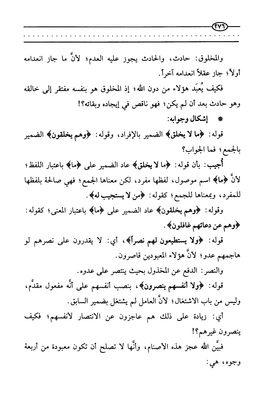 أجيب: بأن قوله: {مَا لَا يَخْلُقُ} عاد الضمير على (ما) باعتبار اللفظ؛ لأن (ما) اسم موصول، لفظها مفرد، لكن معناها الجمع؛ فهي صالحة بلفظها للمفرد، وبمعناها للجمع؛ كقوله: {مَنْ لَا يَسْتَجِيبُ لَهُ} .