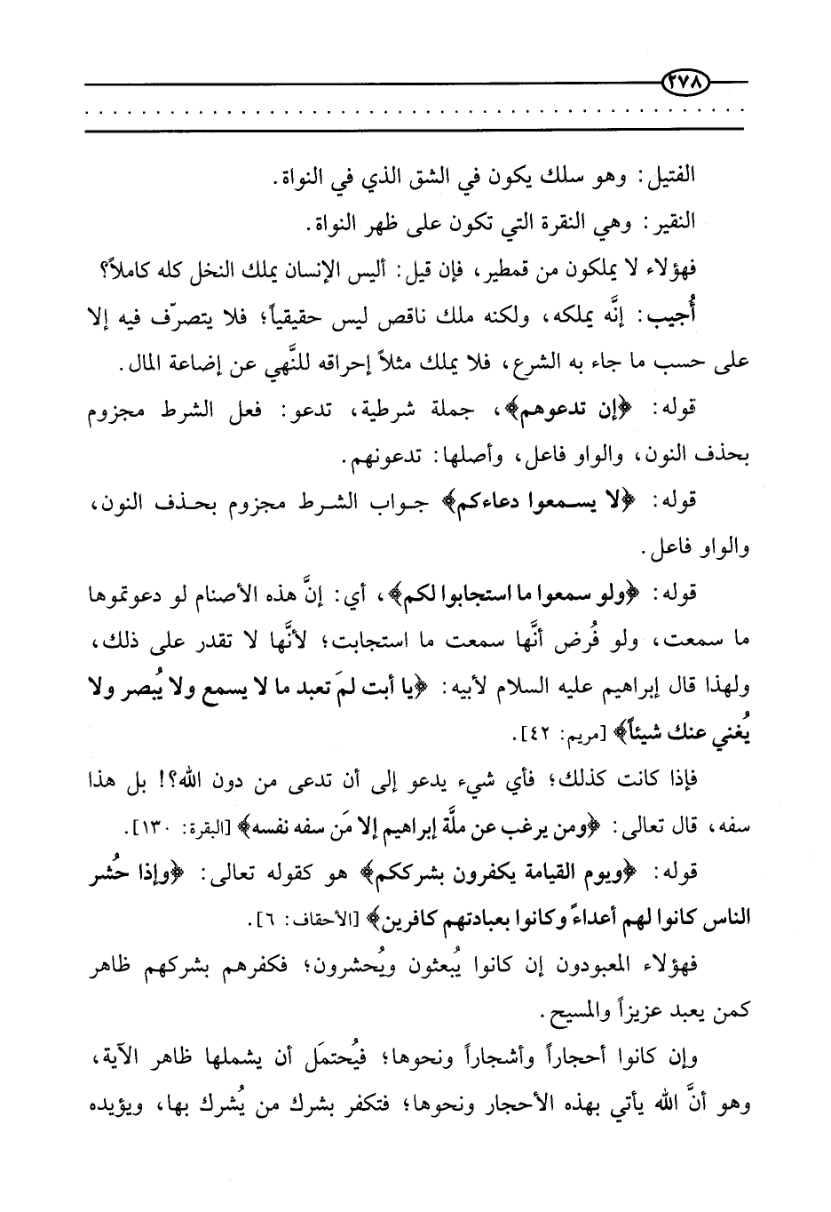 قوله: {وَلَوْ سَمِعُوا مَا اسْتَجَابُوا لَكُمْ} ، أي: إن هذه الأصنام لو دعوتموها ما سمعت، ولو فرض أنها سمعت ما استجابت؛ لأنها لا تقدر على ذلك، ولهذا قال إبراهيم عليه السلام لأبيه: {يَاأَبَتِ لِمَ تَعْبُدُ مَا لَا يَسْمَعُ وَلَا يُبْصِرُ وَلَا يُغْنِي عَنْكَ شَيْئًا} [مريم: 42] .