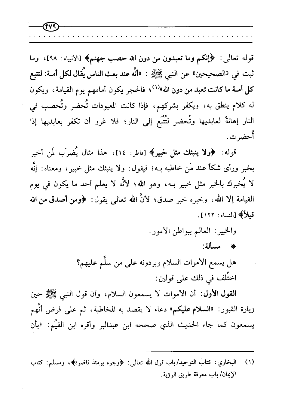 قوله تعالى: {إِنَّكُمْ وَمَا تَعْبُدُونَ مِنْ دُونِ اللَّهِ حَصَبُ جَهَنَّمَ} [الأنبياء: 98] ، وما ثبت في (الصحيحين) عن النبي صَلَّى اللَّهُ عَلَيْهِ وَسَلَّمَ «أنه عند بعث الناس يقال لكل أمة: لتتبع كل أمة ما كانت تعبد من دون الله» ؛ فالحجر يكون أمامهم يوم القيامة، ويكون له كلام ينطق به، ويكفر بشركهم، فإذا كانت المعبودات تحضر وتحصب في النار إهانة لعابديها وتحضر لتتبع إلى النار؛ فلا غرو أن تكفر بعابديها إذا أحضرت.