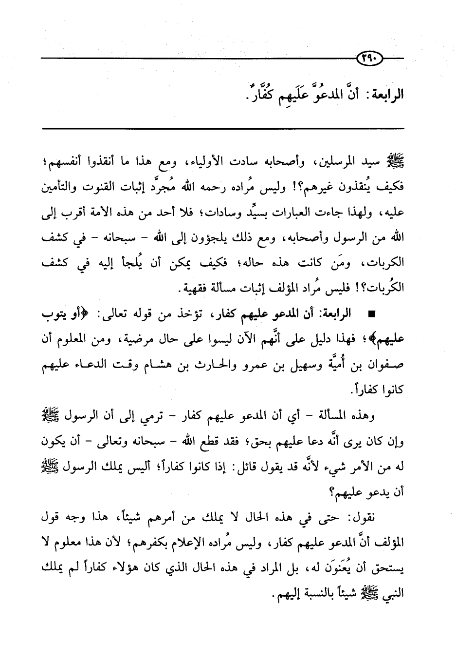 صَلَّى اللَّهُ عَلَيْهِ وَسَلَّمَ سيد المرسلين، وأصحابه سادت الأولياء، ومع هذا ما أنقذوا أنفسهم؛ فكيف ينقذون غيرهم؟ وليس مراده رحمه الله مجرد إثبات القنوت والتأمين عليه؛ ولهذا جاءت العبارات بسيد وسادات؛ فلا أحد من هذه الأمة أقرب إلى الله من الرسول وأصحابه، ومع ذلك يلجئون إلى الله سبحانه في كشف الكربات، ومن كانت هذه حاله؛ فكيف يمكن أن يلجأ إليه في كشف الكربات؟ فليس مراد المؤلف إثبات مسألة فقهية.