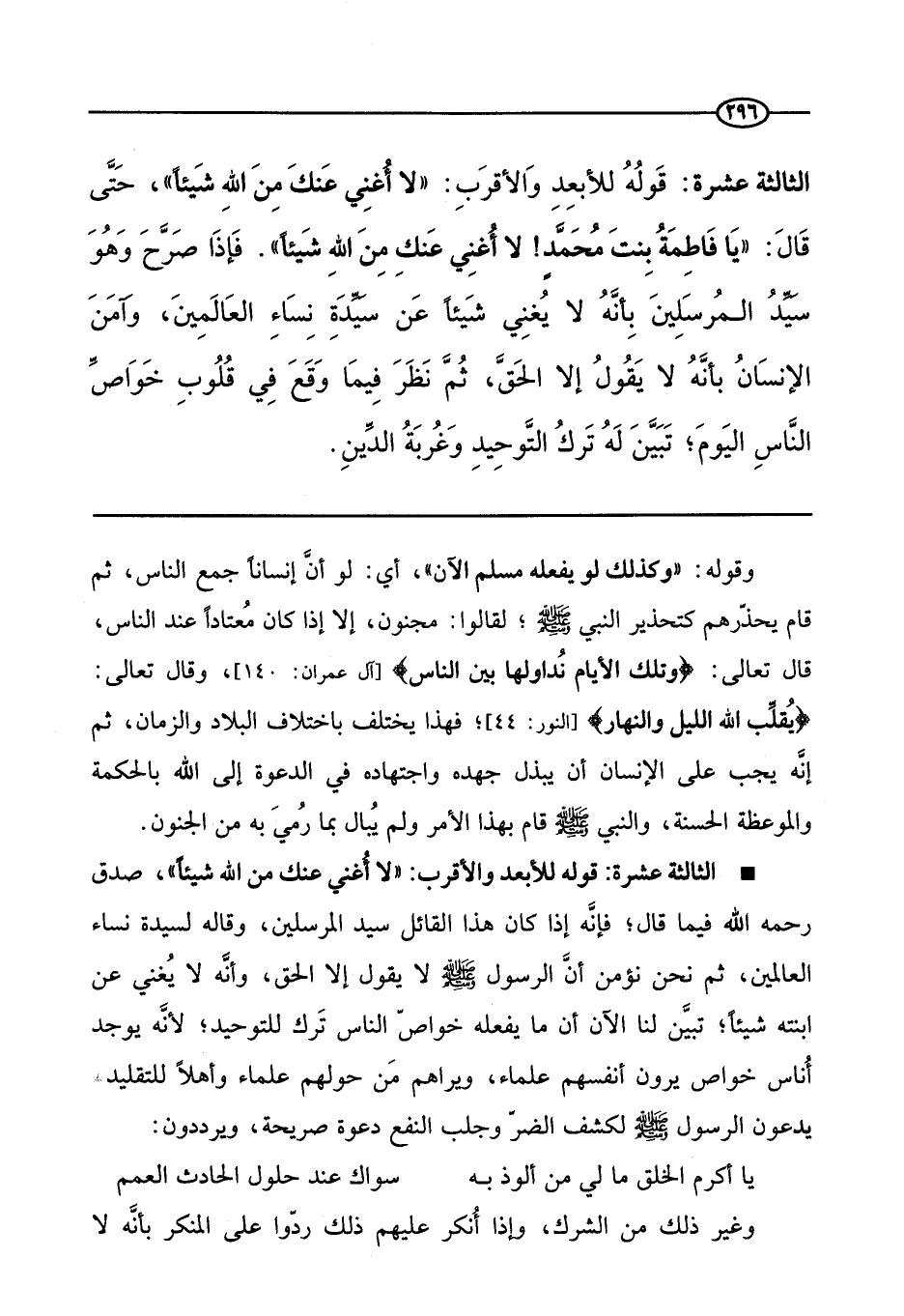 الثالثة عشرة: قوله للأبعد والأقرب: «لا أغني عنك من الله شيئا» ، صدق رحمه الله فيما قال؛ فإنه إذا كان هذا القائل سيد المرسلين، وقاله لسيدة نساء العالمين، ثم نحن نؤمن أن الرسول -صَلَّى اللَّهُ عَلَيْهِ وَسَلَّمَ- لا يقول إلا الحق، وأنه لا يغني عن ابنته شيئا؛ تبين لنا الآن أن ما يفعله خواص الناس ترك للتوحيد؛ لأنه يوجد أناس خواص يرون أنفسهم علماء، ويراهم من حولهم علماء وأهلا للتقليد، يدعون الرسول صَلَّى اللَّهُ عَلَيْهِ وَسَلَّمَ لكشف الضر وجلب النفع دعوة صريحة، ويرددون: