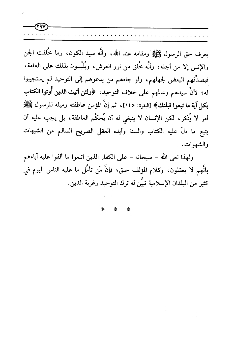 يعرف حق الرسول -صَلَّى اللَّهُ عَلَيْهِ وَسَلَّمَ- ومقامه عند الله، وأنه سيد الكون، وما خلقت الجن والإنس إلا من أجله، وأنه خلق من نور العرش، ويلبسون بذلك على العامة، فيصدقهم البعض لجهلهم، ولو جاءهم من يدعوهم إلى التوحيد لم يستجيبوا له؛ لأن سيدهم وعالمهم على خلاف التوحيد، {وَلَئِنْ أَتَيْتَ الَّذِينَ أُوتُوا الْكِتَابَ بِكُلِّ آيَةٍ مَا تَبِعُوا قِبْلَتَكَ} [البقرة: 145] ، ثم إن المؤمن عاطفته وميله للرسول صَلَّى اللَّهُ عَلَيْهِ وَسَلَّمَ أمر لا ينكر، لكن الإنسان لا ينبغي له أن يحكم العاطفة، بل يجب عليه أن يتبع ما دل عليه الكتاب والسنة وأيده العقل الصريح السالم من الشبهات والشهوات.