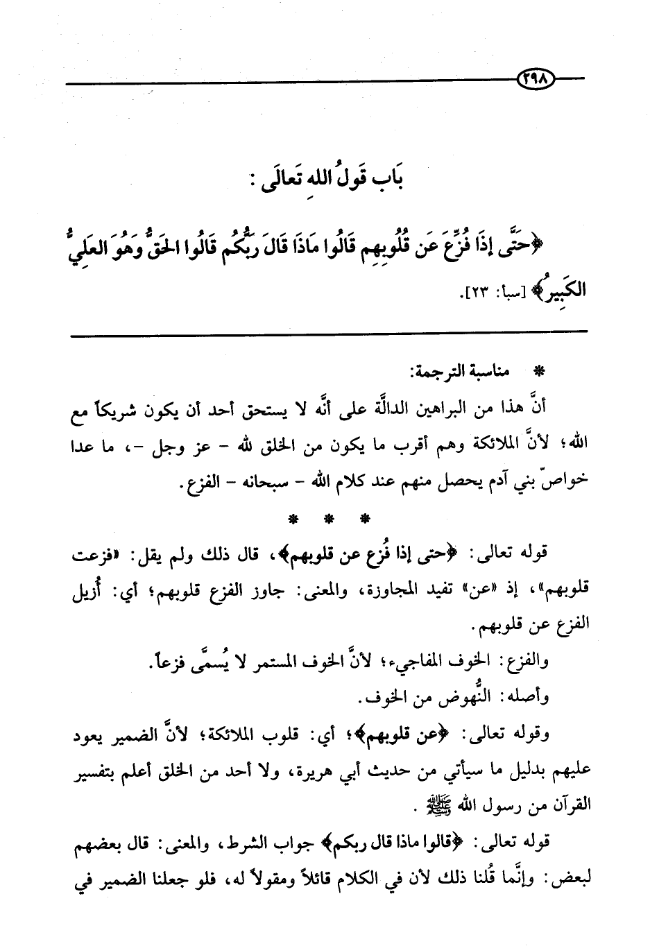 {حَتَّى إِذَا فُزِّعَ عَنْ قُلُوبِهِمْ قَالُوا مَاذَا قَالَ رَبُّكُمْ قَالُوا الْحَقَّ وَهُوَ الْعَلِيُّ الْكَبِيرُ} [سبأ: 23] .
