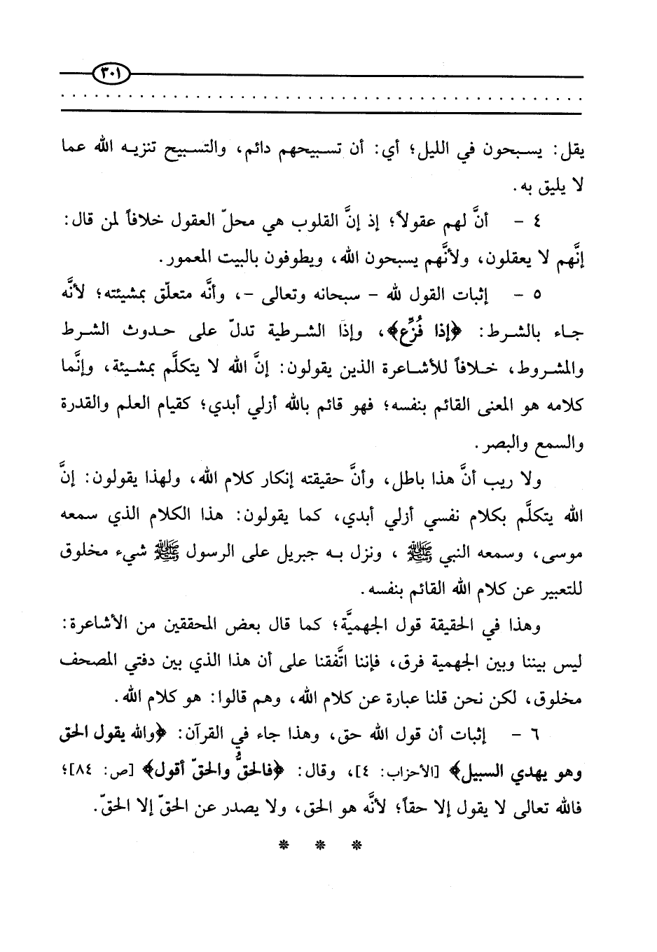 ولا ريب أن هذا باطل، وأن حقيقته إنكار كلام الله، ولهذا يقولون: أن الله يتكلم بكلام نفسي أزلي أبدي، كما يقولون: هذا الكلام الذي سمعه موسى، وسمعه النبي صَلَّى اللَّهُ عَلَيْهِ وَسَلَّمَ، ونزل به جبريل على الرسول -صَلَّى اللَّهُ عَلَيْهِ وَسَلَّمَ- شيء مخلوق للتعبير عن كلام الله القائم بنفسه.