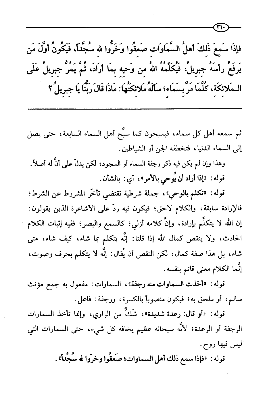 «فإذا سمع ذلك أهل السماوات صعقوا وخروا لله سجدا، فيكون أول من يرفع رأسه جبريل، فيكلمه الله من وحيه بما أراد، ثم يمر جبريل على الملائكة، كلما مر بسماء؛ سأله ملائكتها: ماذا قال ربنا يا جبريل؟» .