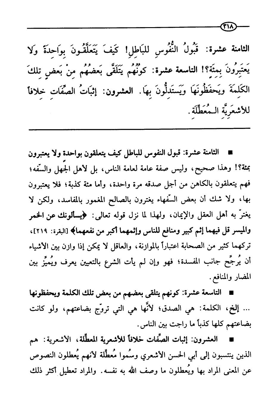 الثامنة عشرة: قبول النفوس للباطل، كيف يتعلقون بواحدة ولا يعتبرون بمائة؟! التاسعة عشرة: كونهم يتلقى بعضهم من بعض تلك الكلمة ويحفظونها ويستدلون بها. العشرون: إثبات الصفات خلافا للأشعرية المعطلة.
