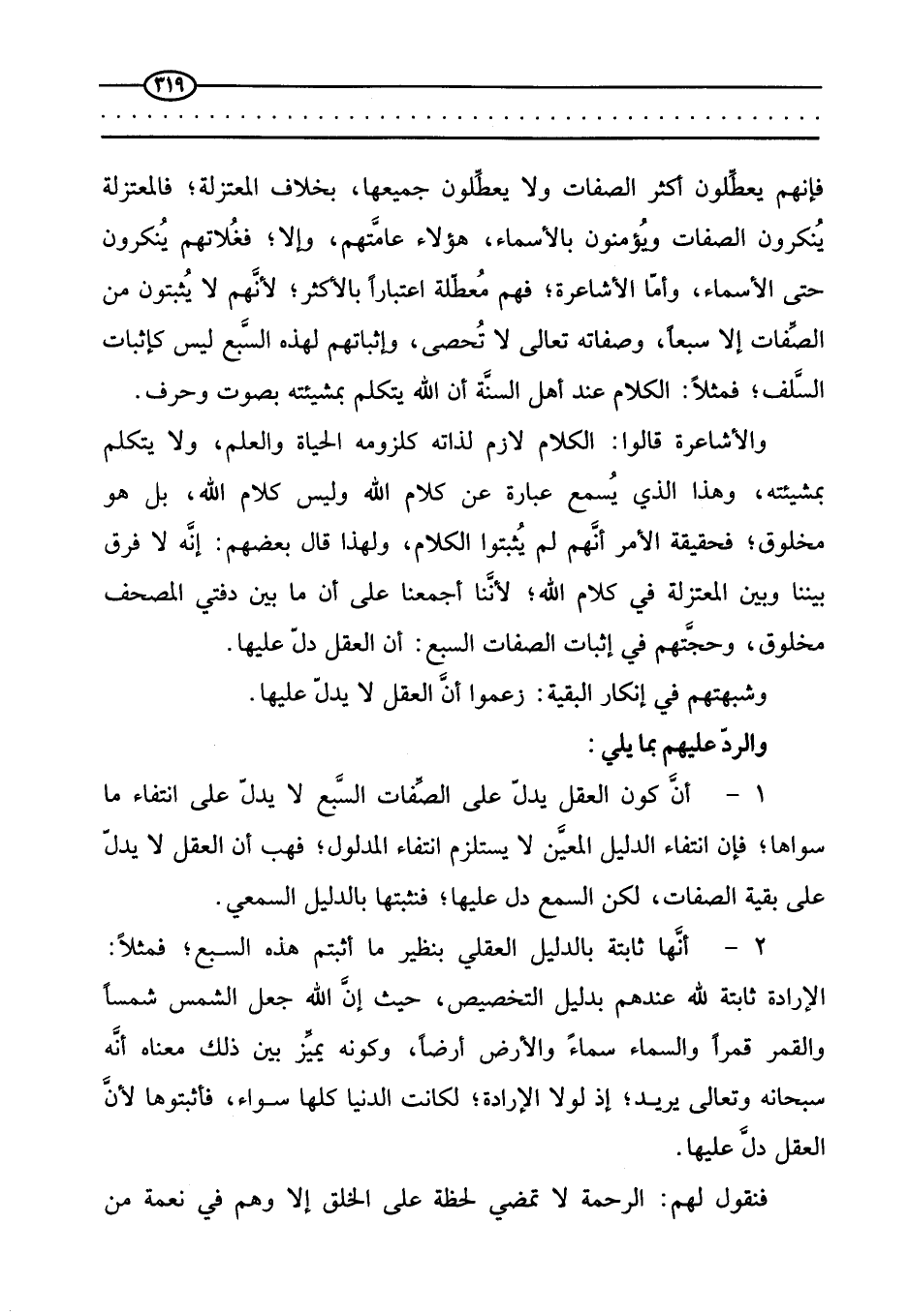 1 - أن كون العقل يدل على الصفات السبع لا يدل على انتفاء ما سواها؛ فإن انتفاء الدليل المعين لا يستلزم انتفاء المدلول؛ فهب أن العقل لا يدل على بقية الصفات، لكن السمع دل عليها؛ فنثبتها بالدليل السمعي.