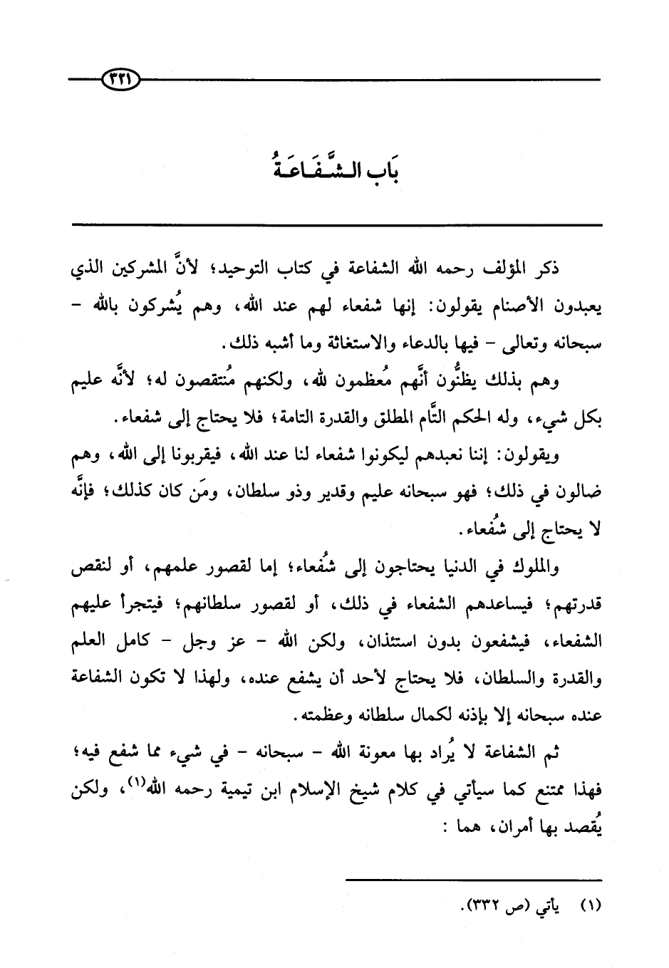 ذكر المؤلف رحمه الله الشفاعة في كتاب التوحيد؛ لأن المشركين الذي يعبدون الأصنام يقولون: إنها شفاعة لهم عند الله، وهم يشركون بالله -سبحانه وتعالى- فيها بالدعاء والاستغاثة وما أشبه ذلك.