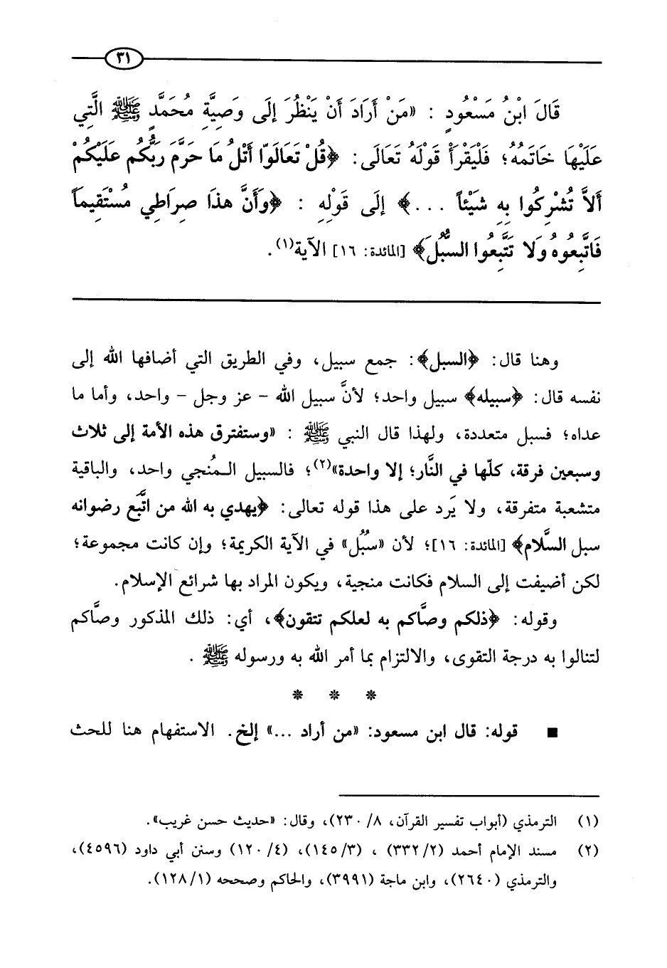(¬1) مسند الإمام أحمد 1/299، سنن أبي داود: كتاب الطهارة / باب المواضع التي نهى النبي صلى الله عليه وسلم عن التبول فيها، وابن ماجة: كتاب الطهارة/باب النهي عن الخلاء على قارعة الطريق، والحاكم ـ وقال: (صحيح) ، ووافقه الذهبي