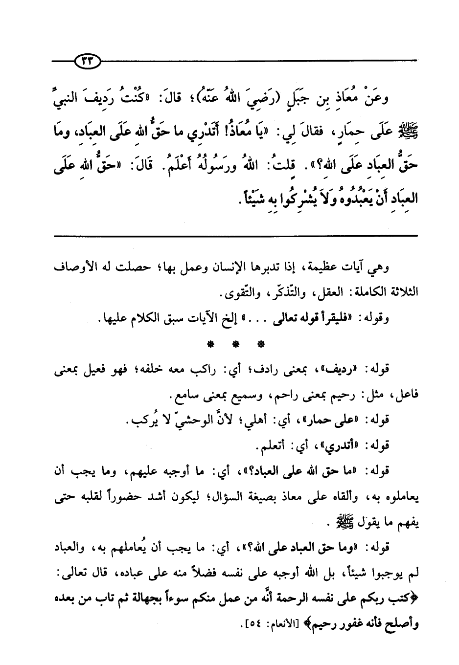الثالثة عشرة: معرفة حق الله علينا. وذلك بأن نعبده ولا نشرك به شيئا.