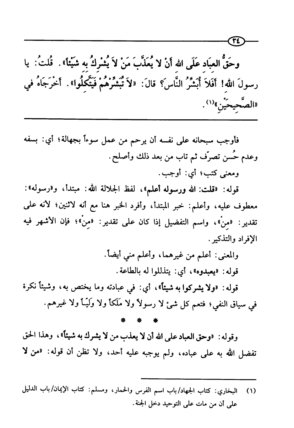 الرابعة عشرة: معرفة حق العباد عليه إذا أدوا حقه. وذلك بأن لا يعذب من لا يشرك به شيئا، أما من أشرك؛ فإنه حقيق أن يعذب.