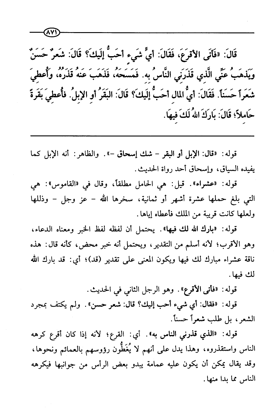 «قال: " فأتى الأقرع فقال: أي شيء أحب إليك؟ قال: شعر حسن ويذهب عني الذي قذرني الناس به. فمسحه فذهب عنه قذره، وأعطي شعرا حسنا. فقال: أي المال أحب إليك؟ قال: البقر أو الإبل. فأعطي بقرة حاملا، قال: بارك الله لك فيها» .