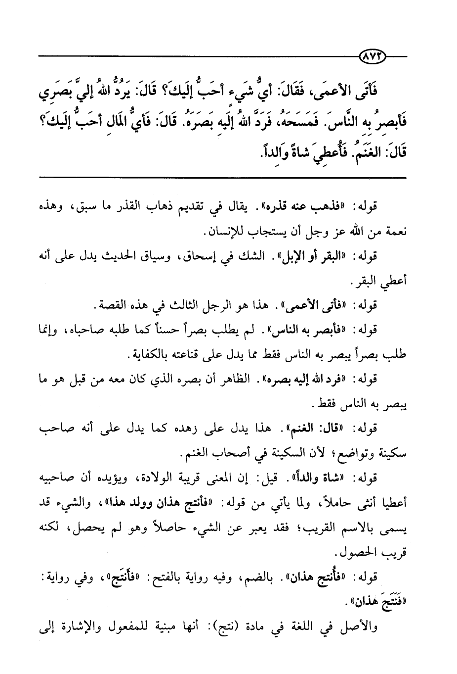 «فأتى الأعمى فقال: أي شيء أحب إليك؟ قال: يرد الله إلي بصري فأبصر به الناس. فمسحه، فرد الله إليه بصره. قال: فأي المال أحب إليك؟ قال: الغنم. فأعطي شاة والدا» .