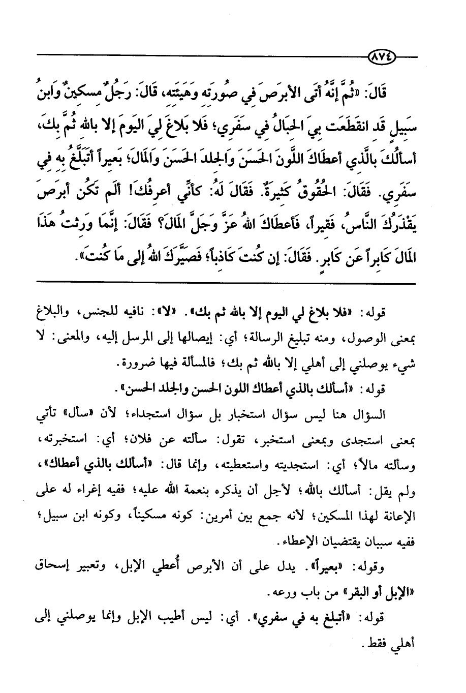 «قال: " ثم إنه أتى الأبرص في صورته وهيئته، وقال: رجل مسكين وابن سبيل قد انقطعت بي الحبال في سفري، فلا بلاغ لي اليوم إلا بالله ثم بك، أسألك بالذي أعطاك اللون الحسن والجلد الحسن والمال بعيرا أتبلغ به في سفري. فقال: الحقوق كثيرة. فقال له: كأني أعرفك، ألم تكن أبرص يقذرك الناس فقيرا، فأعطاك الله عز وجل المال؟ فقال: إنما ورثت هذا المال كابرا عن كابر. فقال: إن كنت كاذبا فصيرك الله إلى ما كنت» .