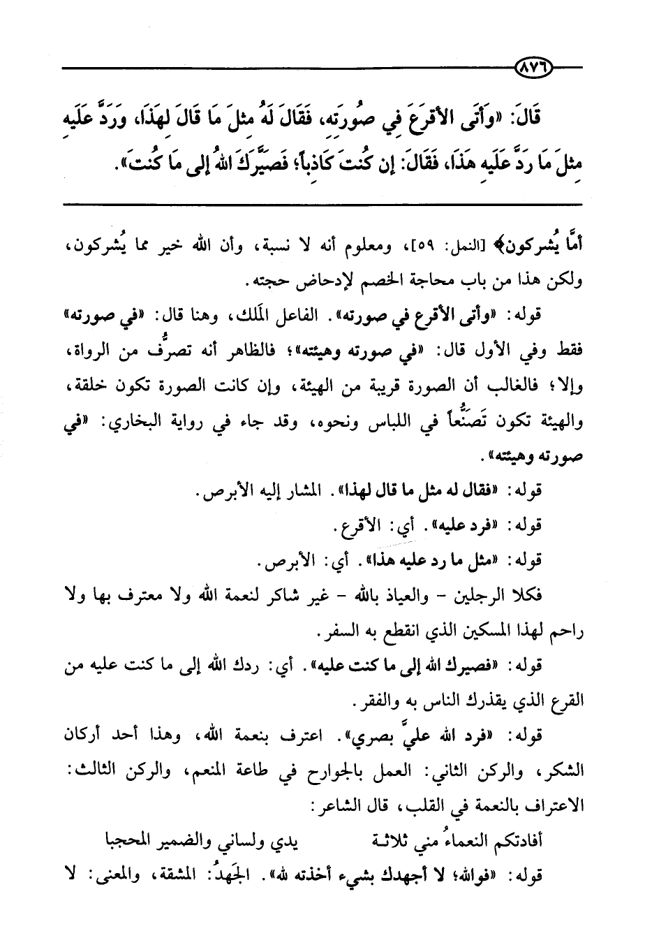قوله: «وأتى الأقرع في صورته» . الفاعل الملك، وهنا قال: (في صورته) فقط، وفي الأول قال: (في صورته وهيئته) ، فالظاهر أنه تصرف من الرواة، وإلا فالغالب أن الصورة قريبة من الهيئة، وإن كانت الصورة تكون خلقة، والهيئة تكون تصنعا في اللباس ونحوه، وقد جاء في رواية البخاري: " في صورته وهيئته ".