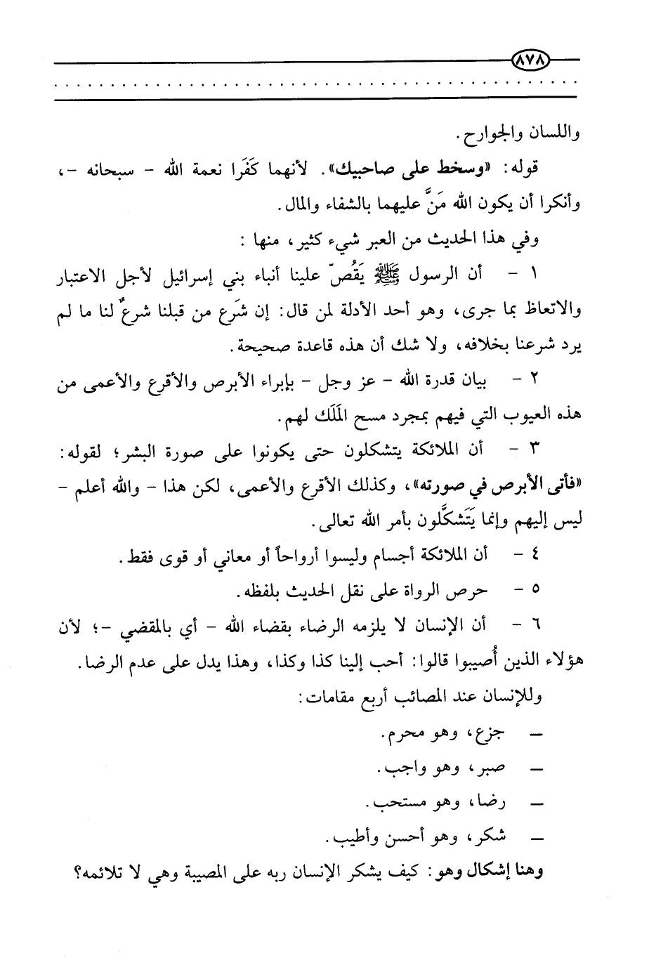 3. أن الملائكة يتشكلون حتى يكونوا على صورة البشر، لقوله: «فأتى الأبرص في صورته» ، وكذلك الأقرع والأعمى لكن هذا - والله أعلم - ليس إليهم وإنما يتشكلون بأمر الله تعالى.