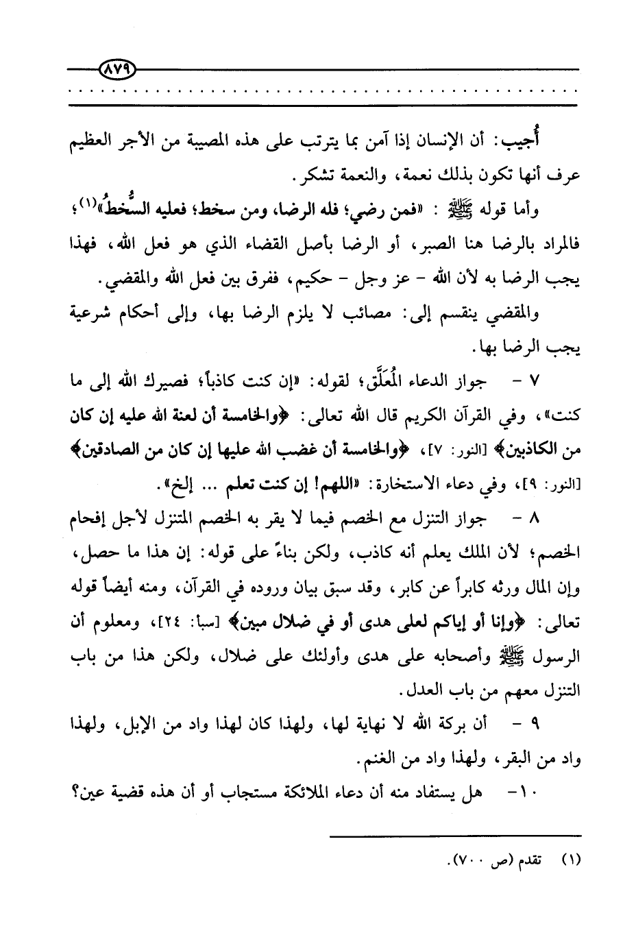 وأما قوله - صَلَّى اللَّهُ عَلَيْهِ وَسَلَّمَ -: «فمن رضي فله الرضا، ومن سخط، فعليه السخط» ، فالمراد بالرضا هنا الصبر، أو الرضا بأصل القضاء الذي هو فعل الله، فهذا يجب الرضا به لأن الله - عز وجل - حكيم ففرق بين فعل الله والمقضي.
