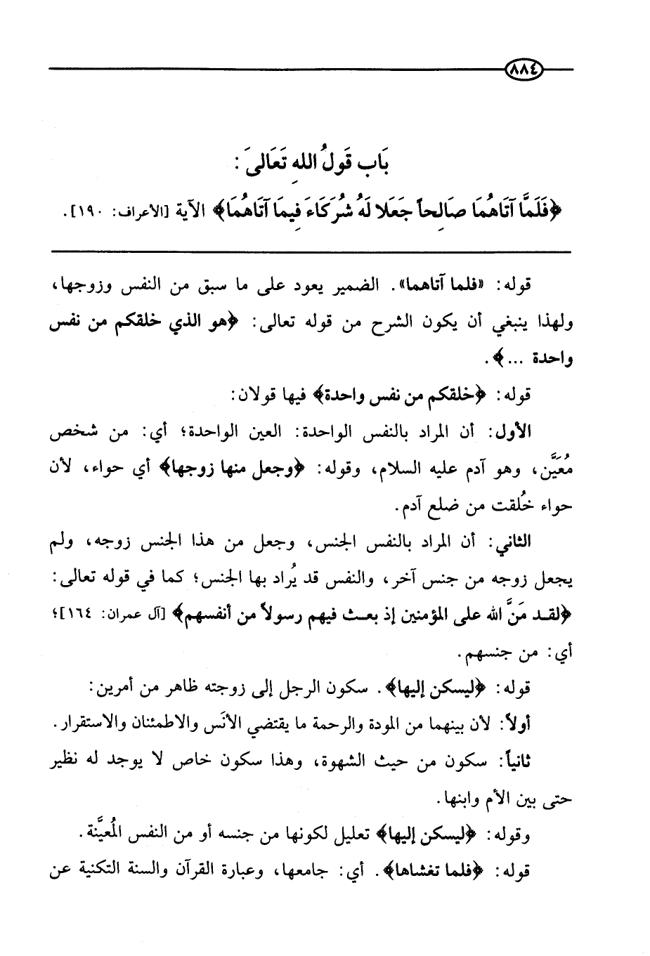 قوله: {فَلَمَّا آتَاهُمَا} . الضمير يعود على ما سبق من النفس وزوجها، ولهذا ينبغي أن يكون الشرح من قوله تعالى {هُوَ الَّذِي خَلَقَكُمْ مِنْ نَفْسٍ وَاحِدَةٍ} .
