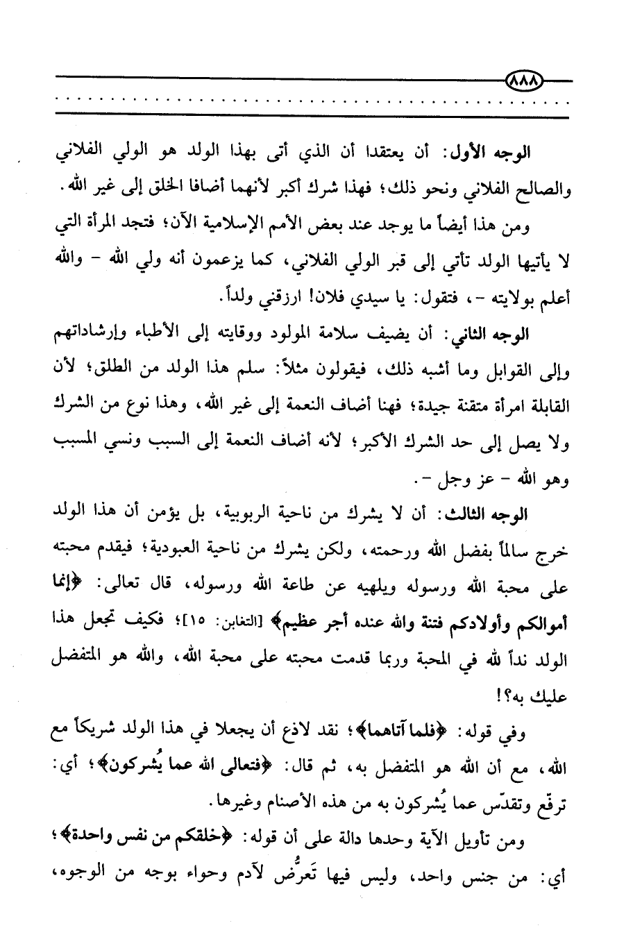الوجه الثالث: أن لا يشرك من ناحية الربوبية بل يؤمن أن هذا الولد خرج سالما بفضل الله ورحمته، ولكن يشرك من ناحية العبودية، فيقدم محبته على محبة الله ورسوله ويلهيه عن طاعة الله ورسوله قال تعالى {إِنَّمَا أَمْوَالُكُمْ وَأَوْلَادُكُمْ فِتْنَةٌ وَاللَّهُ عِنْدَهُ أَجْرٌ عَظِيمٌ} [التغابن: 15] فكيف تجعل هذا الولد ندا لله في المحبة وربما قدمت محبته على محبة الله، والله هو المتفضل عليك به؟ !