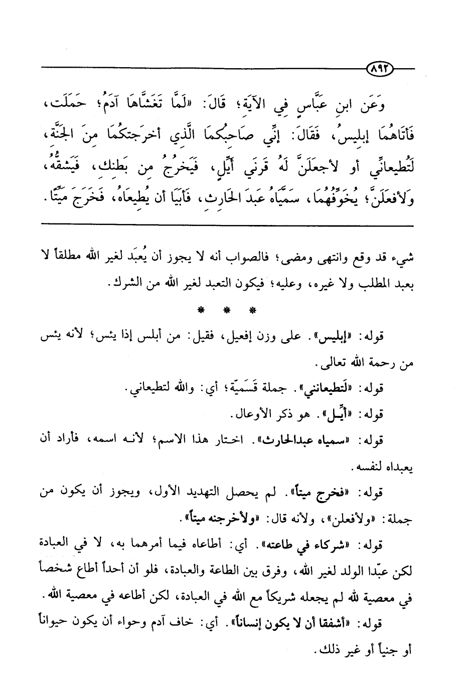 وعن ابن عباس في الآية، قال: لما تغشاها آدم، حملت، فأتاهما إبليس، فقال: إني صاحبكما الذي أخرجتكما من الجنة، لتطيعاني أو لأجعلن له قرني أيل، فيخرج من بطنك، فيشقه، ولأفعلن، يخوفهما، سمياه عبد الحارث، فأبيا أن يطيعانه، فخرج ميتا.
