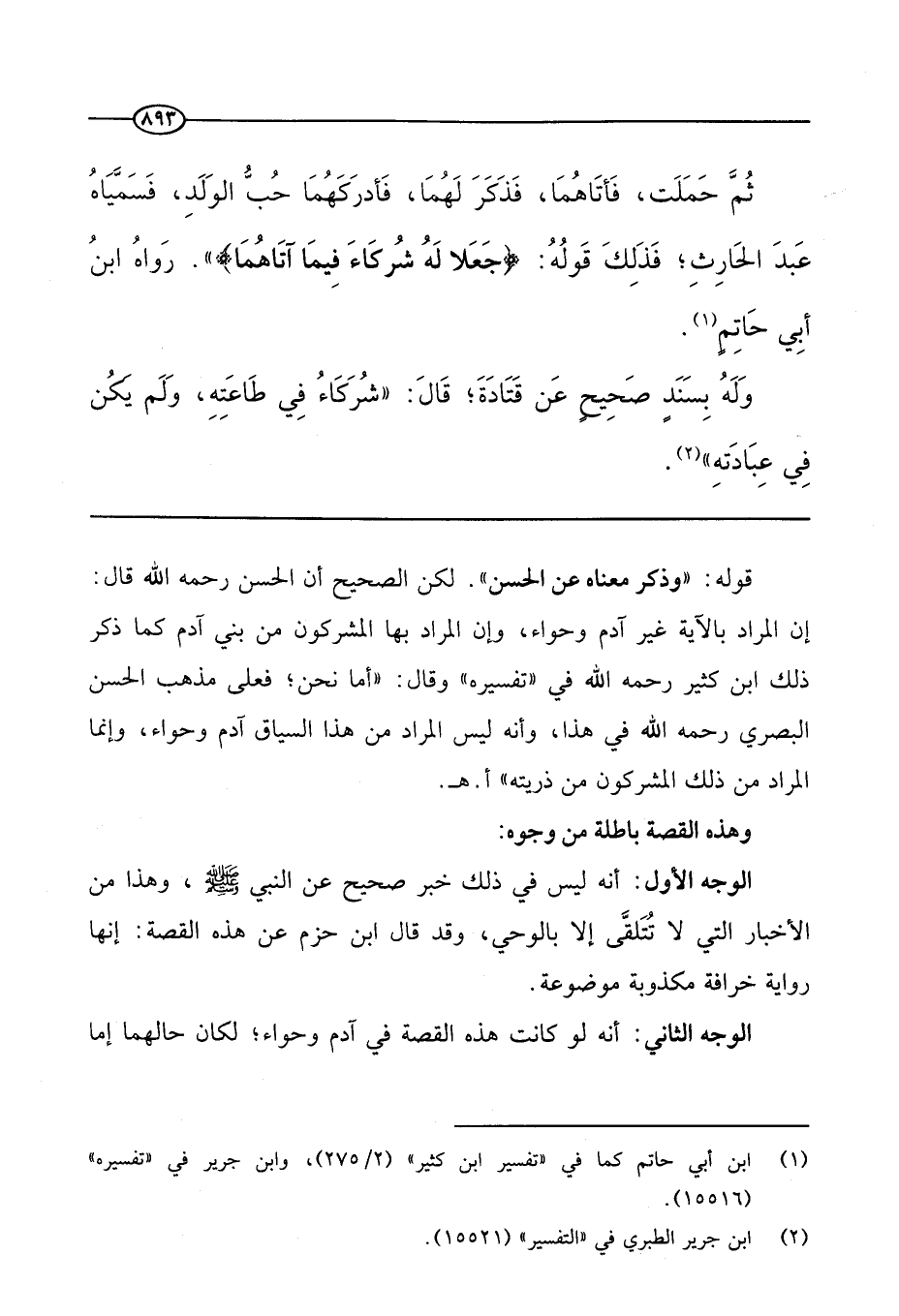 قوله (وذكر معناه عن الحسن) 0 لكن الصحيح أن الحسن - رحمه الله - قال: إن المراد بالآية غير آدم وحواء، وإن المراد بها المشركون من بني آدم كما ذكر ذلك ابن كثير - رحمه الله - في " تفسيره " وقال: " أما نحن، فعلى مذهب الحسن البصري - رحمه الله - في هذا، وأنه ليس المراد من هذا السياق آدم وحواء، وإنما المراد من ذلك المشركون من ذريته " اهـ.