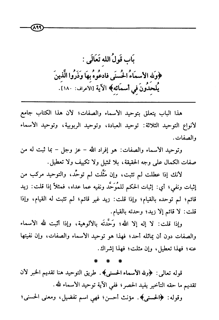 هذا الباب يتعلق بتوحيد الأسماء والصفات؛ لأن هذا الكتاب جامع لأنواع التوحيد الثلاثة: توحيد العبادة، وتوحيد الربوبية، وتوحيد الأسماء والصفات.