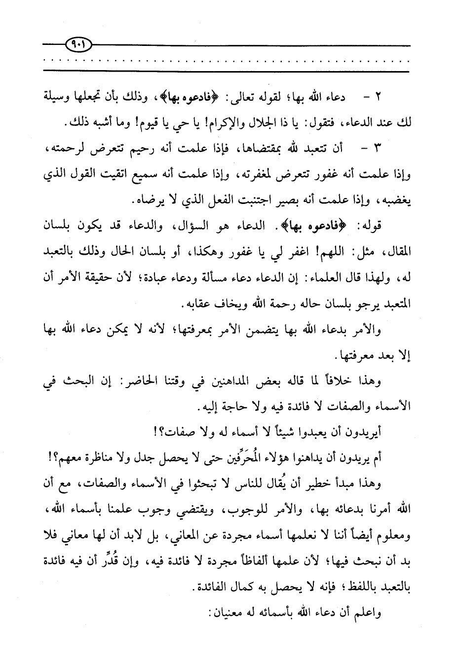 وهذا مبدأ خطير أن يقال للناس لا تبحثوا في الأسماء والصفات، مع أن الله أمرنا بدعائه بها، والأمر للوجوب، ويقتضي وجوب علمنا بأسماء الله، ومعلوم أيضا أننا لا نعلمها أسماء مجردة عن المعاني، بل لا بد أن لها معاني فلا بد أن نبحث فيها؛ لأن علمها ألفاظا مجردة لا فائدة فيه، وإن قدر أن فيه فائدة بالتعبد باللفظ، فإنه لا يحصل به كمال الفائدة.