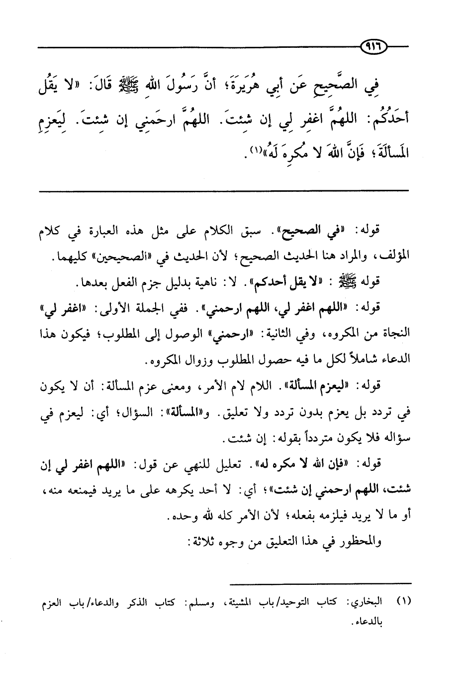 في الصحيح عن أبي هريرة، أن رسول الله - صَلَّى اللَّهُ عَلَيْهِ وَسَلَّمَ - قال: «لا يقل أحدكم: اللهم اغفر لي إن شئت اللهم ارحمني إن شئت ليعزم المسألة، فإن الله لا مكره له» .