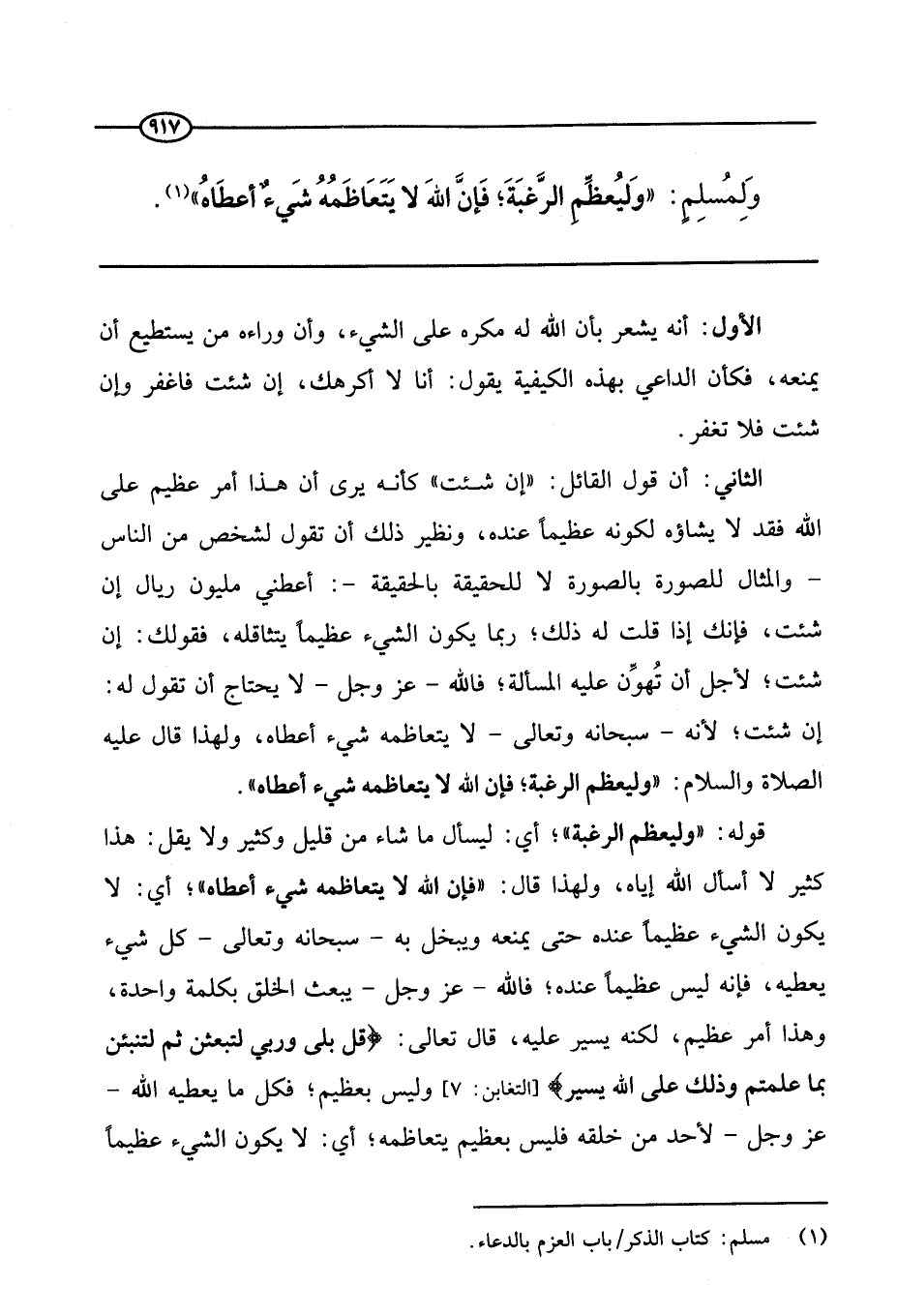 الثاني: أن أقول القائل: " إن شئت " كأنه يرى أن هذا أمر عظيم على الله فقد لا يشاؤه لكونه عظيما عنده، ونظير ذلك أن تقول لشخص من الناس - والمثال للصورة بالصورة لا للحقيقة بالحقيقة - أعطني مليون ريال إن شئت، فإنك إذا قلت له ذلك، ربما يكون الشيء عظيما يتثاقله، فقولك: إن شئت، لأجل أن تهون عليه المسألة، فالله - عز وجل - لا يحتاج أن تقول له: إن شئت؛ لأنه - سبحانه وتعالى - لا يتعاظمه شيء أعطاه، ولهذا قال عليه الصلاة والسلام: «وليعظم الرغبة، فإن الله لا يتعاظمه شيء أعطاه» .