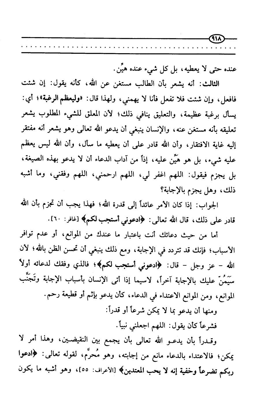 الثالث: أنه يشعر بأن الطالب مستغن عن الله، كأنه يقول: إن شئت فأفعل، وإن شئت فلا تفعل فأنا لا يهمني، ولهذا قال: «وليعظم الرغبة» أي يسأل برغبة عظيمة، والتعليق ينافي ذلك؛ لأن المعلق للشيء المطلوب يشعر تعليقه بأنه مستغن عنه، والإنسان ينبغي أن يدعو الله تعالى وهو يشعر أنه مفتقر إليه غاية الافتقار، وأن الله قادر على أن يعطيه ما سأل، وأن الله ليس يعظم عليه شيء، بل هو هين عليه، إذًا من آداب الدعاء أن لا يدعو بهذه الصيغة، بل يجزم فيقول: اللهم اغفر لي، اللهم ارحمني، اللهم وفقني، وما أشبه ذلك، وهل يجزم بالإجابة؟
