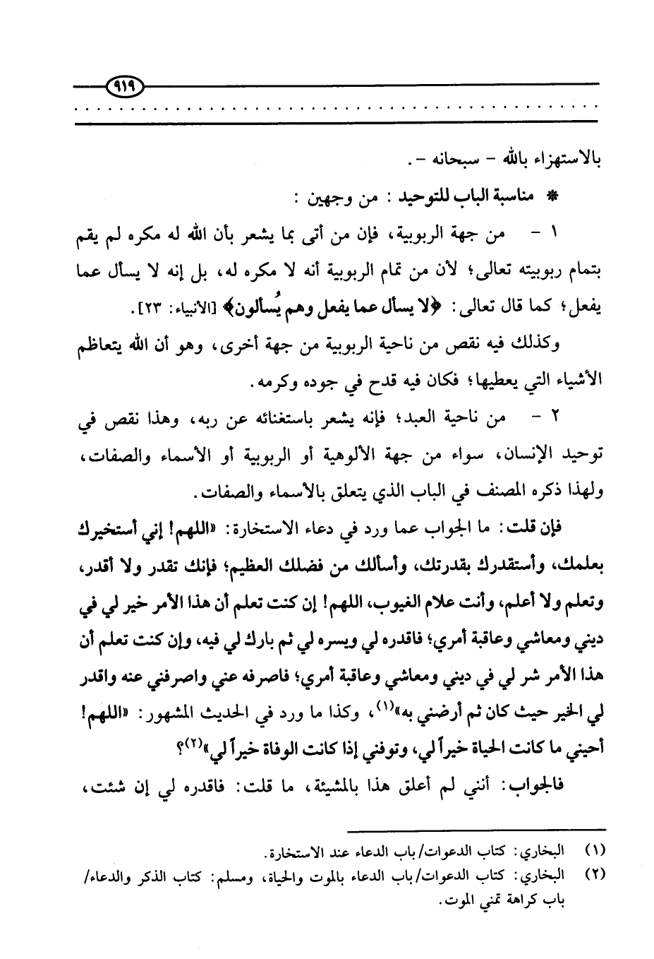 2 - من ناحية العبد، فإنه يشعر باستغنائه عن ربه، وهذا نقص في توحيد الإنسان، سواء من جهة الألوهية أو الربوبية أو الأسماء والصفات، ولهذا ذكره المصنف في الباب الذي يتعلق بالأسماء والصفات.